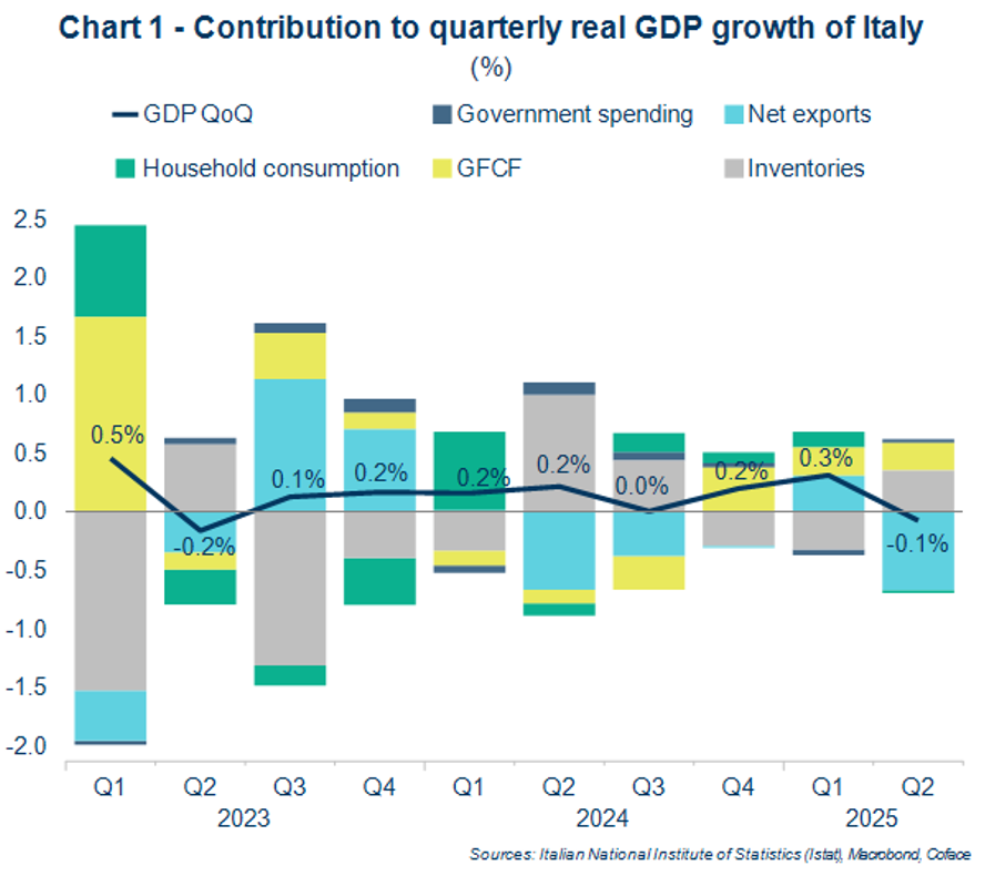 Ve druhém čtvrtletí roku 2025 klesl italský HDP oproti předchozímu čtvrtletí o 0,1 %, což byl první pokles za poslední dva roky, a potvrdil tak křehkost svého růstu (země se na úroveň HDP před krizí v roce 2008 vrátila až na konci roku 2024). Tento pokles je způsoben především poklesem zahraniční poptávky, který je důsledkem slabosti jejích hlavních obchodních partnerů a geopolitické nejistoty. Vývoz zboží se ve druhém čtvrtletí snížil o 2,2 % po dočasném nárůstu souvisejícím s očekáváním nových cel v USA. Zároveň spotřeba domácností zůstává pomalá, brzdí ji nízká důvěra a kupní síla, která se navzdory stabilizaci inflace jen těžko zotavuje.